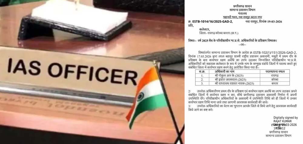 छत्तीसगढ़ शासन सामान्य प्रशासन विभाग मंत्रालय द्वारा संबंधित जिला कलेक्टरों जारी किया गया है. इसमें गोकुल आरके को रायगढ़, इशांत जयसवाल को कोरबा और वाध्यावथ यशवंत नायक को बस्तर जिले में पदस्थ किया गया है.