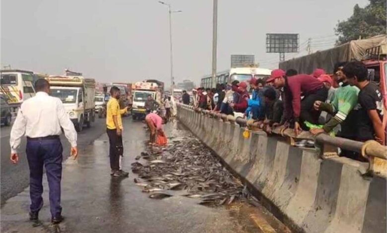 सोनीपत में नेशनल हाइवे-44 पर शुक्रवार को सुबह उस समय लंबा जाम लग गया, जब एक मछलियों से भरा ट्रक पलट गया। कैंटर में भरी मछलियां रोड़ पर फैल गई। यह नज़ारा देखते ही वहां लोगों की भीड़ जुट गई, जिसकी वजह से हाईवे पर जाम लग गया।