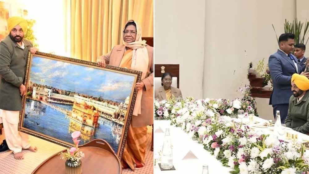 सीएम भगवंत मान ने अमृतसर के होटल ताज स्वर्ण में राष्ट्रपति द्रौपदी मुर्मू से मुलाकात की। इस दौरान उन्होंने राष्ट्रपति को श्री हरिमंदिर साहिब की तस्वीर भेंट कर सम्मानित किया। इस अवसर पर राज्यपाल गुलाब चंद कटारिया भी उपस्थित थे। राष्ट्रपति ने सीएम मान और राज्यपाल के साथ रात्रि भोज किया। बता दें, राष्ट्रपति द्रौपदी मुर्मू गुरु नानक देव यूनिवर्सिटी की 50वीं गोल्डन जुबली कन्वेंशन में शामिल होने अमृतसर पहुंचीं थीं, जिसमें वह मुख्य मेहमान रहीं।