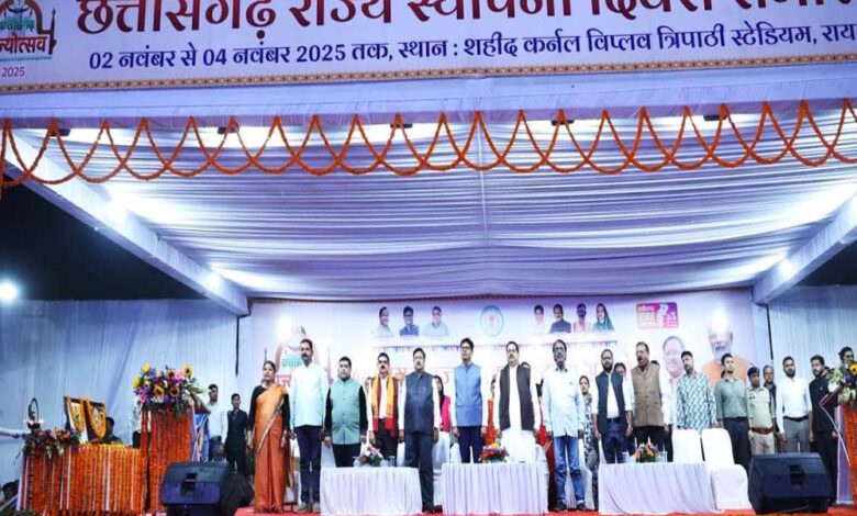 छत्तीसगढ़ राज्य स्थापना दिवस के रजत जयंती वर्ष पर रायगढ़ जिला मुख्यालय स्थित शहीद कर्नल विप्लव त्रिपाठी स्टेडियम में आयोजित राज्योत्सव कार्यक्रम का शुभारंभ प्रदेश के वित्त मंत्री ओ.पी.चौधरी ने भारत माता और छत्तीसगढ़ महतारी के छायाचित्र के समक्ष दीप प्रज्वलित कर किया। उन्होंने सभी को रजत जयंती की हार्दिक बधाई दी।