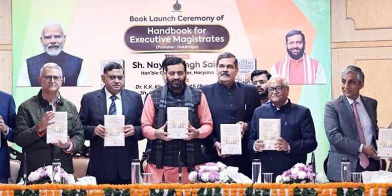 हरियाणा के मुख्यमंत्री नायब सिंह सैनी ने मंगलवार को ‘हैंडबुक फॉर एग्जीक्यूटिव मजिस्ट्रेट्स’ का विमोचन किया। यह पुस्तक वरिष्ठ आईएएस अधिकारी (सेवानिवृत्त) डॉ. केके खंडेलवाल और हरियाणा सरकार में अतिरिक्त मुख्य सचिव अपूर्व कुमार सिंह द्वारा लिखी गई है। हरियाणा आईएएस ऑफिसर्स एसोसिएशन के तत्वाधान में आयोजित पुस्तक विमोचन समारोह में आईएएस एसोसिएशन के पदाधिकारी तथा कई वरिष्ठ प्रशासनिक अधिकारी उपस्थित रहे। इस मौके पर हरियाणा आईएएस ऑफिसर एसोसिएशन के सचिव डॉ. अमित अग्रवाल ने एसोसिएशन की ओर से मुख्यमंत्री नायब सिंह सैनी को स्मृति चिन्ह भेंट किया।